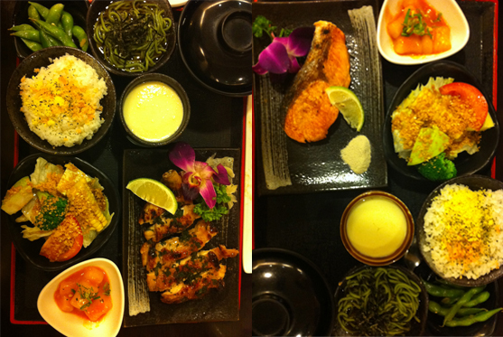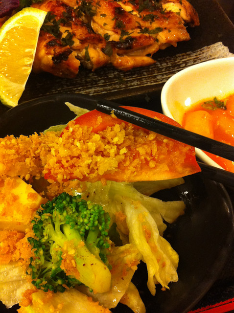主菜上場了!左邊是我的「梅醬雞腿」右邊是同學的「鹽燒鮭魚」,整個滿滿的配菜!讚!