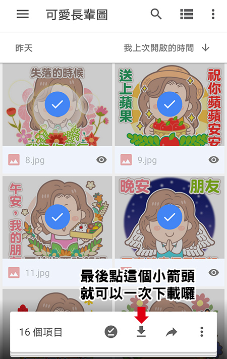 最後再點下方的灰色箭頭就可以完成貼圖一次打包下載囉!